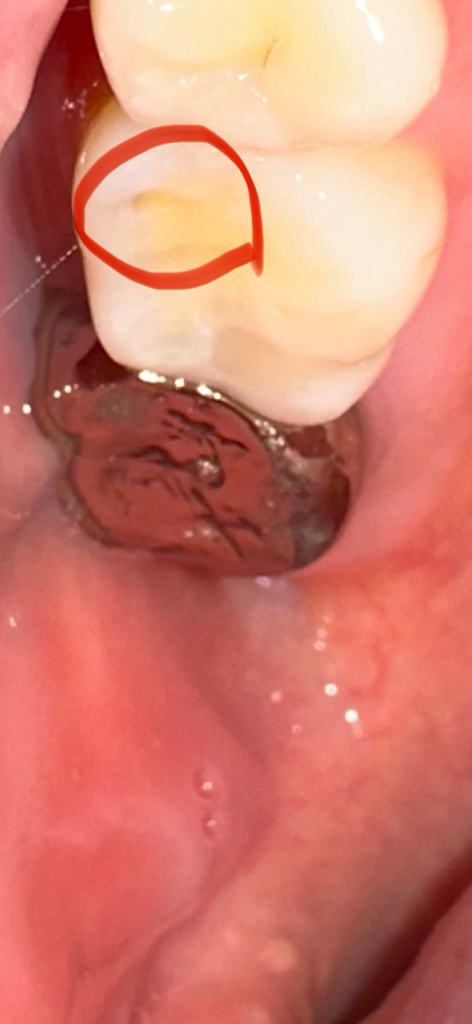 현재 치아에 충치로 인해 구멍이 생긴것으로 보이며, 방치시에 충치가 더 진행이 되기에 가능한 빠른시일내에 치과에 방문하여 치료를 받길 권합니다.