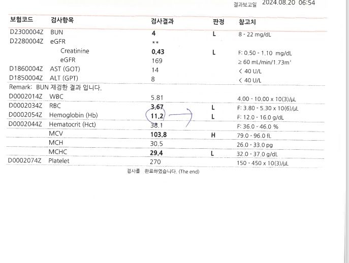 피검사 후 헤모글로빈이 11.2 로 빈혈 의심되서 원장님이 정밀검사 해보자고 하셨어요