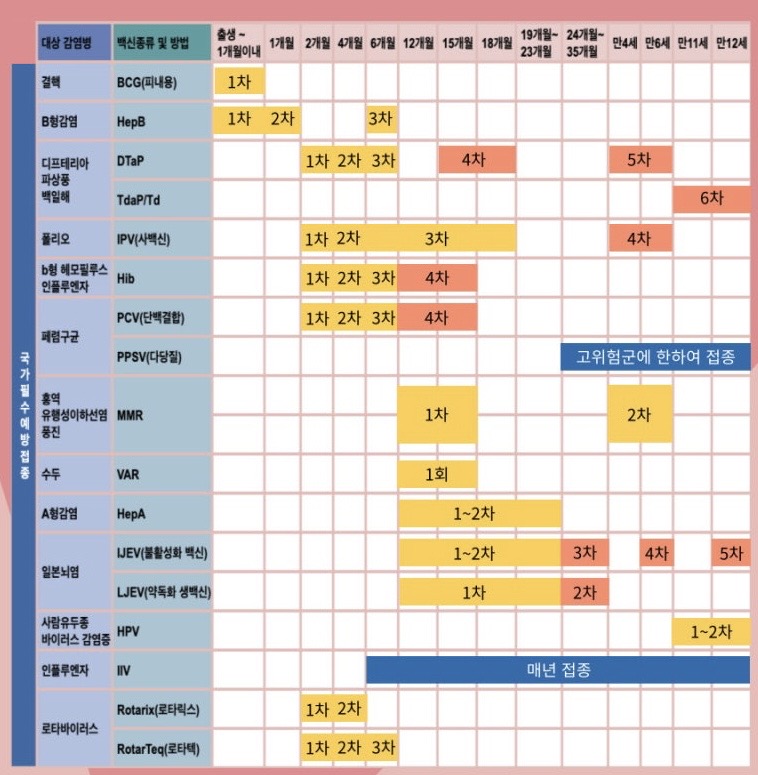 아래 표에 나와있는 접종들이 모두 국가 필수 예방접종이며 무료로 접종이 시행됩니다.