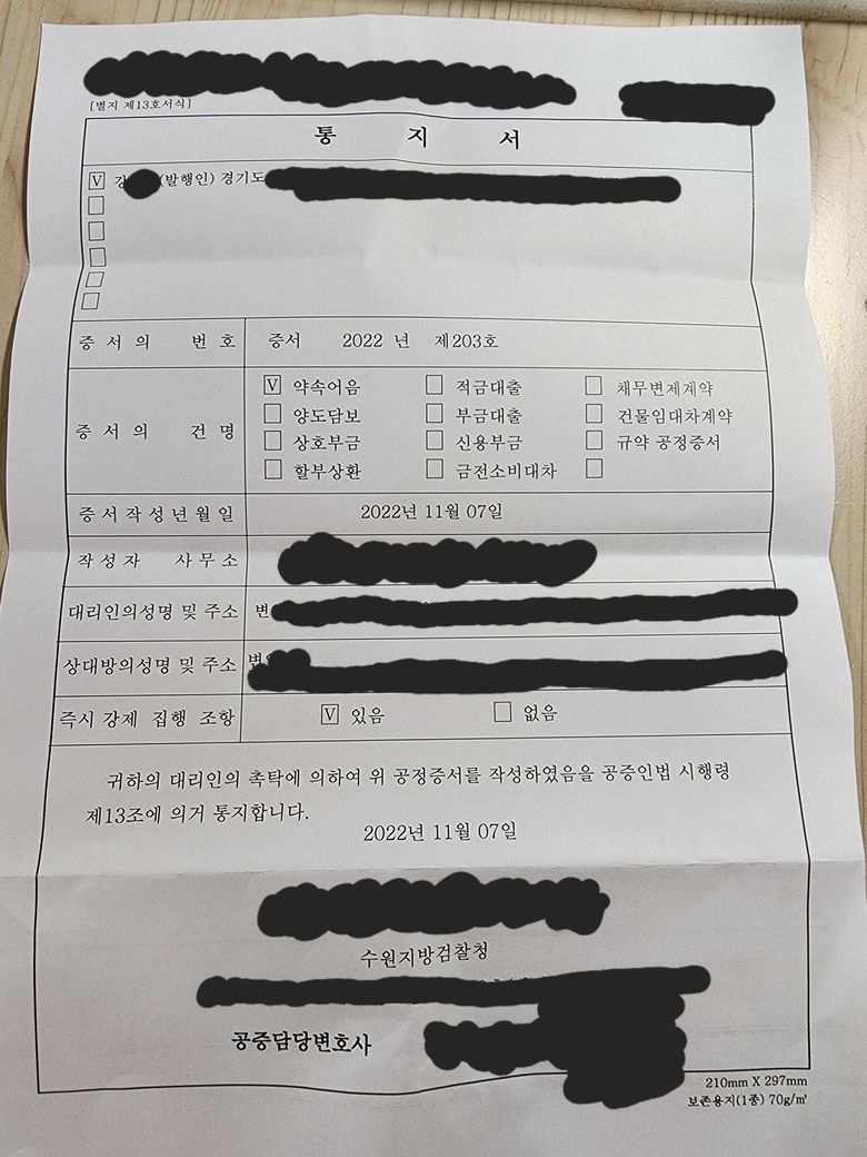 근데 오늘 약속어음 통지서 공정증서를 우편으로 받았습니다.