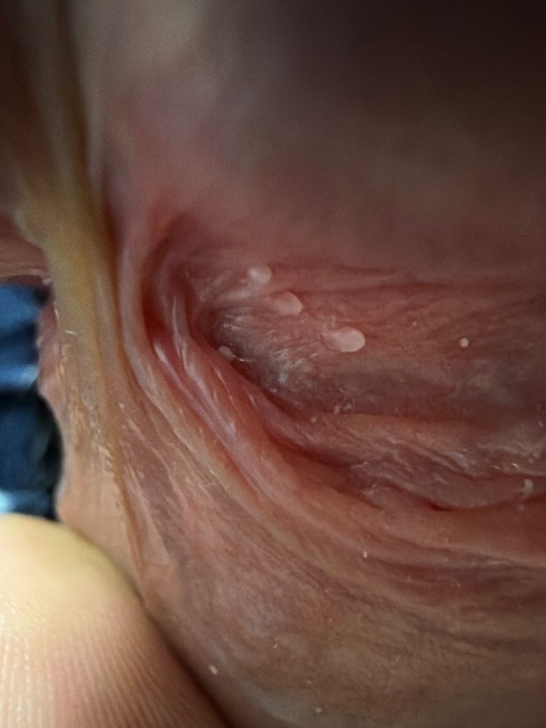 사진상으로는 귀두 안쪽 점막에 작은 흰색 돌기들이 군집해 보이며, 통증·출혈·진물은 뚜렷하지 않은 상태로 보입니다. 이 양상은 진주양 구진, 피지선 돌출 등 양성 변화에서 흔히 관찰됩니다. 성병, 특히 헤르페스나 사마귀의 전형적인 소견(심한 통증의 물집, 궤양, 빠르게 커지는 사마귀 모양)과는 다소 거리가 있습니다.