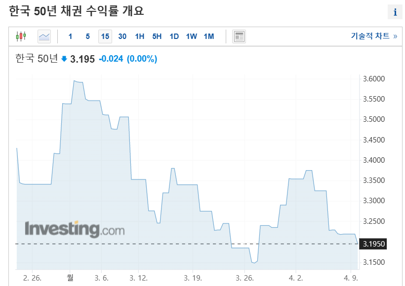 가장 만기가 길게 발행된 채권은 50년만기 채권을 기준으로 하며, 이자율은 명목이 아니라 실질 이자율을 토대로 산출하게 됩니다. 우리나라의 50년만기 채권의 실질금리는 3.195%이며 변동은 다음의 사진을 참고해주세요