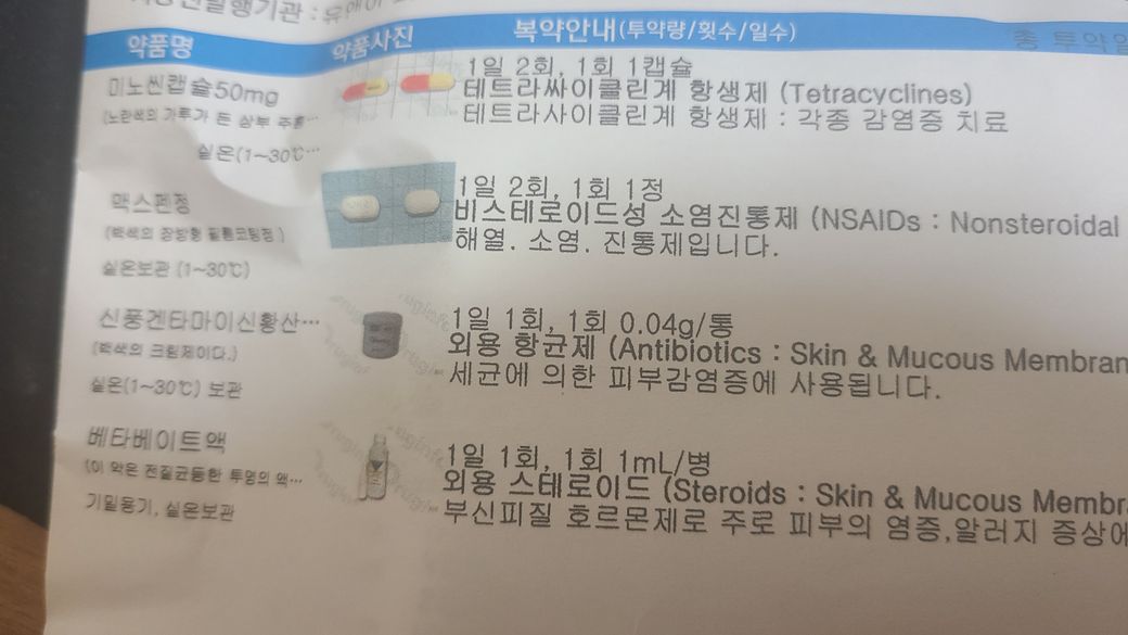 먹는 항생제(미노씬)의 경우 세균을 억제하거나 죽이는 역할을 하기 때문에 백신의 이상반응 및 효과에 영향이 없다고 봅니다. 외용 항생제, 외용 스테로이드는 국소적으로 작용하므로 더 영향이 없습니다. 비스테로이드서 소염진통제(맥스펜)는 위에서 언급드렸다시피 의구심은 있지만 CDC 에서는 복용 가능하다고 합니다.