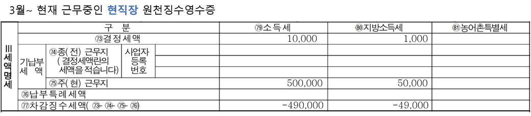 그리고 현직장의 차감징수세액인 [소득세-49만원과 지방소득세 -4만9천원]을