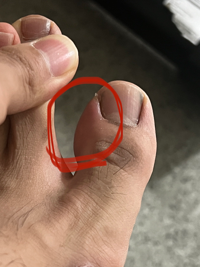 정확한 진단을 위해서 진료를 보실 필요가 있습니다. 현재 사진은 정확하지는 않지만 발톱 내측 주변으로 열감, 통증, 발적 등의 증상이 있다면 내성 발톱으로 인한 증상일 가능성이 있습니다.