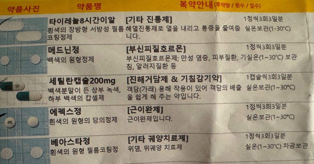 해당 처방약중 메드닌정이 위장장애를 일으킬 수 있습니다.