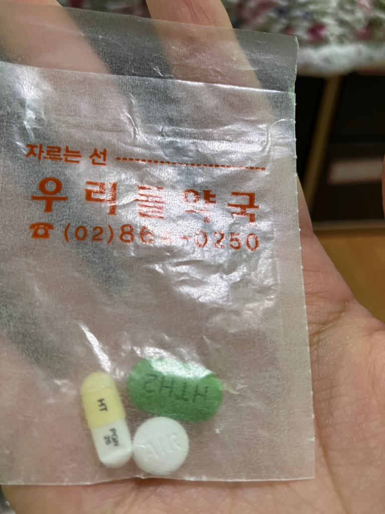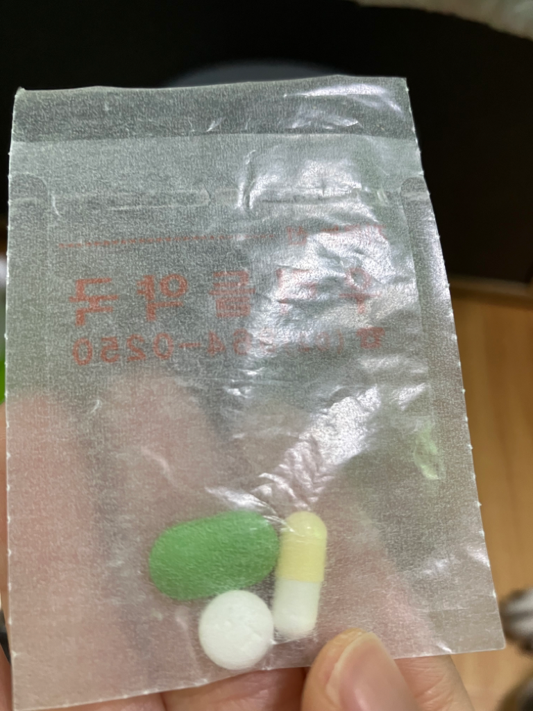 캡슐은 리레카캡슐25mg라는 신경통약, 초록색약은 휴티렌투엑스정이라는 위장약, 흰색약은 에어클란정이라는 소염진통제에요.