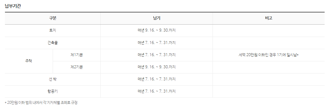 주택분 : 7월과 9월에 각각 50%씩 고지, 재산세액이 20만원 이하라면 7월에 일시납