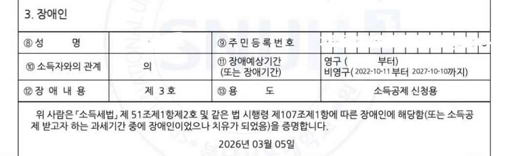 상증법상 장애인은 상속개시일 현재 의사, 치과의사, 한의사로부터 장애인 판정을 받은 자를 말하며, 상증 별지 제4호 서식인 "장애인증명서"를 제출하여 입증해야 하는 것이 원칙이기에 소득공제용 장애인 증명서는 인정되지 않을 수 있습니다.