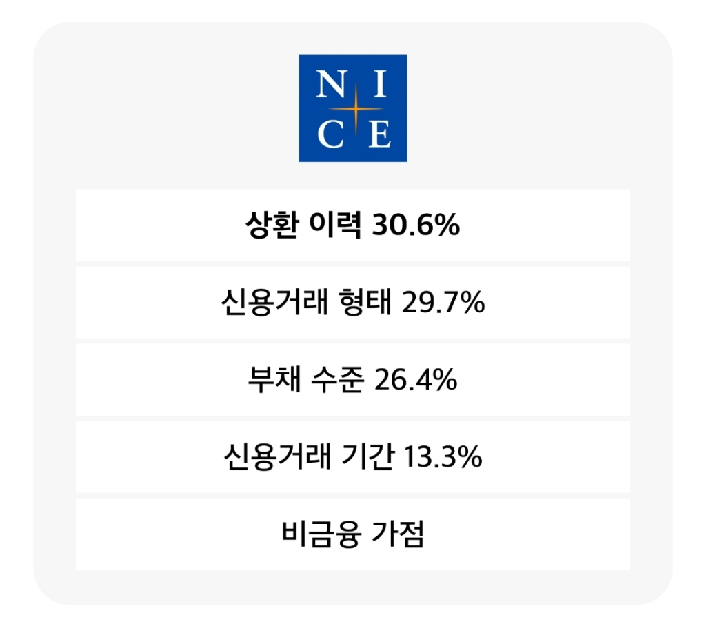 신용점수를 산정할 때에 상환 이력, 부채 수준, 신용 거래 기간, 신용 거래 형태 등을