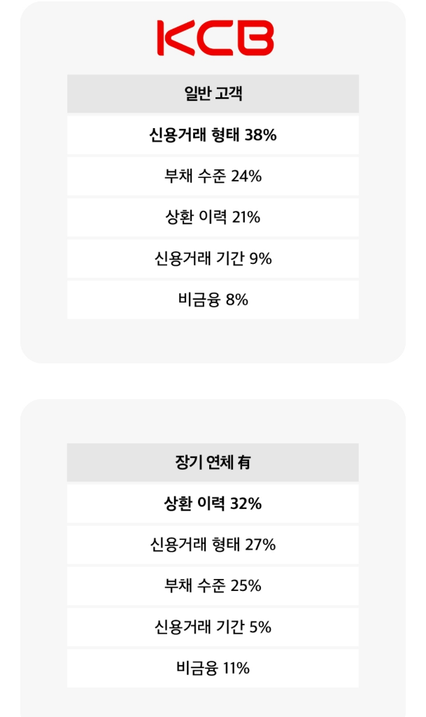 상환이력 항목은 NICE가 KCB보다 더 반영을 합니다. 은행이나 보험사는 따라서 NICE 를 더 선호합니다.