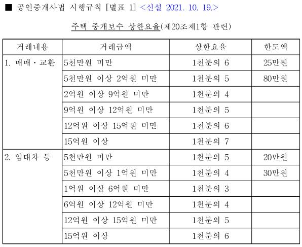 제20조(중개보수 및 실비의 한도 등) ①법 제32조제4항에 따른 주택의 중개에 대한 보수는 중개의뢰인 쌍방으로부터 각각 받되, 그 일방으로부터 받을 수 있는 한도는 별표 1과 같으며, 그 금액은 법 제32조제4항에 따라 시ㆍ도의 조례로 정하는 요율한도 이내에서 중개의뢰인과 개업공인중개사가 서로 협의하여 결정한다. <개정 2014. 7. 29., 2021. 10. 19.>