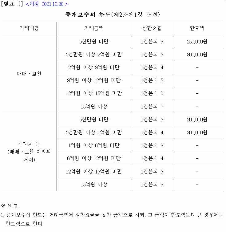 제2조(중개보수) ① 「공인중개사법」(이하 "법"이라 한다) 제32조제4항의 규정에 의한 주택의 중개에 대한 보수(이하 "중개보수"라 한다)의 한도는 별표 1과 같다. <개정 2015.4.14., 2022.12.30.>