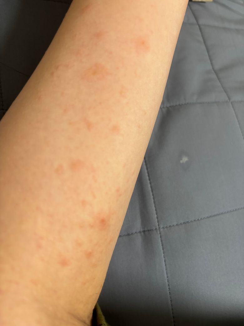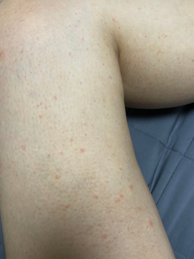 제발 도와주세요 간지러움은 없는 허벅지 팔 홍반과 두드러기 성병 증상인가요?