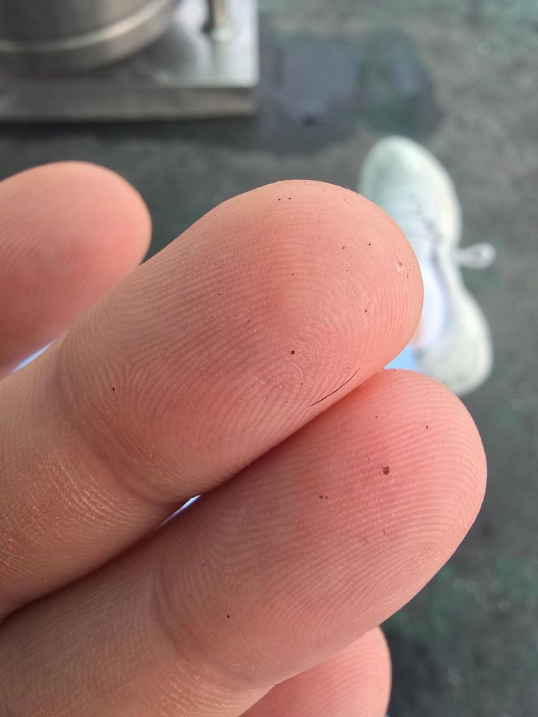 사진상 손가락 지문 사이에 보이는 작은 검은 점들은 피하출혈 형태보다는 외부 이물 또는 표면 착색에 더 가깝게 보입니다. 피하출혈이라면 보통 점상출혈 형태로 붉거나 자주색을 띠고, 눌러도 색이 유지되며 점이 피부 깊이에 있는 양상인데, 현재는 피부 표면에 점처럼 붙어 있는 모습입니다.