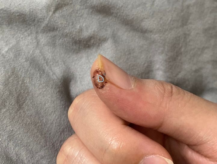 동그라미 치신 부분이 출혈로 인한 피딱지라 보이긴 하나 문제가 되는 수준이라 보기 어렵습니다. 그냥 내버려두시면 회복할만한 상태입니다. 상처가 부어오르거나 붉어지는 등의 변화가 나타나면 그 때는 병원을 방문하시기 바랍니다.