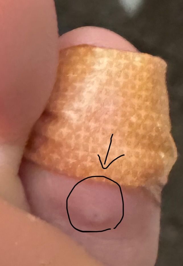 표면이 매끈하고 연한 분홍색의 작은 둔덕(구근처럼) 형태라서, 전형적인 모낭염과는 조금 다릅니다. 발가락은 털이 거의 없기 때문에 모낭염 가능성도 낮습니다.