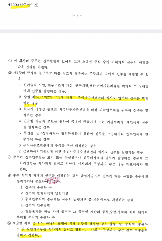 저희 정관의 내용이 코스닥 표준 정관을 사용 하다보니 정관에 명시되어 있는 부분 때문에 문의 드립니다. 정관의 10조 5항 부분이 스톡옵션 행사에 대하여 이사회 결의가 필요하다는 의미 인지, 주식의 종류와 발행가격에 대하여만 이사회로 결의한다는 것인지 잘 모르겠습니다.