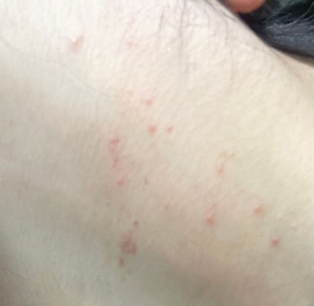 작은 붉은 점 형태로 다발성으로 생기면 모낭 염증도 고려됩니다. 다만 사진에서는 농포가 뚜렷하진 않아 접촉성 피부염 쪽에 조금 더 가깝습니다.