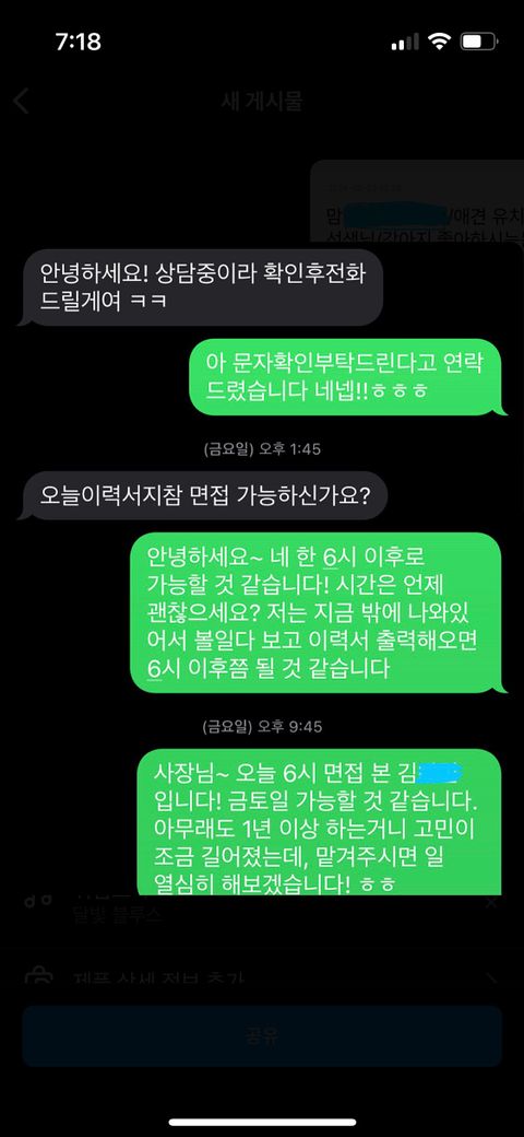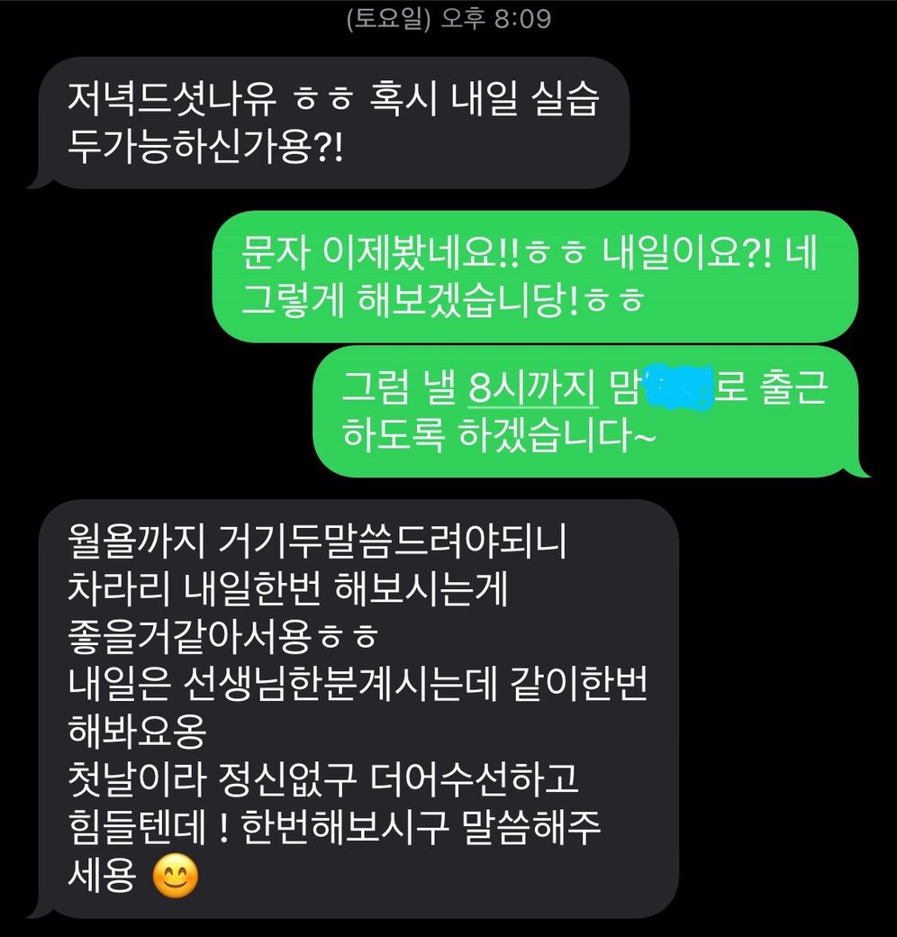 그렇게 퇴근하고 일해보니까 괜찮았다고 열심히 해보겠다 이런식으로 연락을 드리려고 했으나 화요일에 문자 이제 봤다고 답이 오셔서 그날 통화를 할 수 있었어요.
