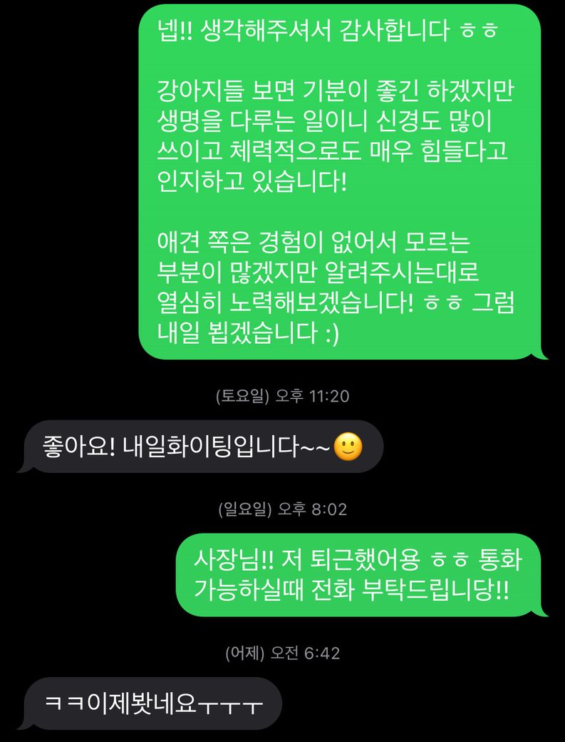 개인적으로 일이 힘들었지만 애견쪽이 배워보고 싶은 분야였고, 요즘 주휴수당 안줄려고 풀근무로 구하는 곳도 잘 없었기 때문에 체력 기를겸 버텨야지 싶었어요.