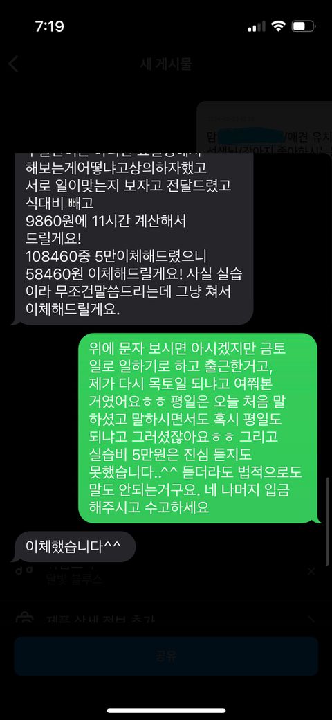 그렇게 말하니 그러면 일단 실습비 이체해주고 시간 조율해보고 하루이틀 내로 연락 줄테니, 정 시간이 안맞으면 다른 알바 구하셔야겠다고 하시더라고요.