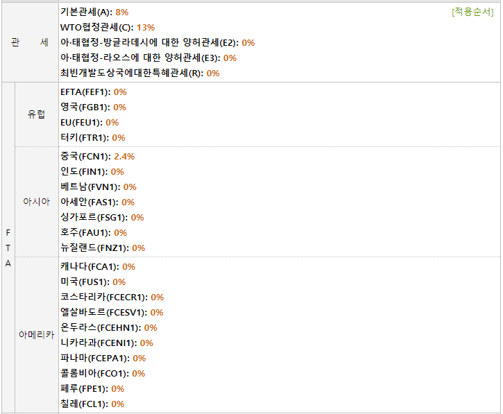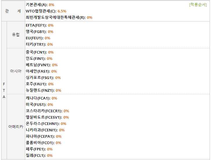 해당 HS CODE는 기본세율이 8%이며 FTA관세 등 관세는 다음과 같습니다.