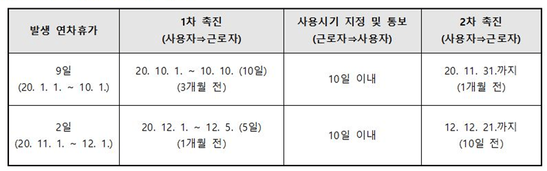 - 이 경우 먼저 발생한 연차 9일과 이후 발생한 연차 2일의 사용촉진 시기가 다름을 유의하셔야 합니다.