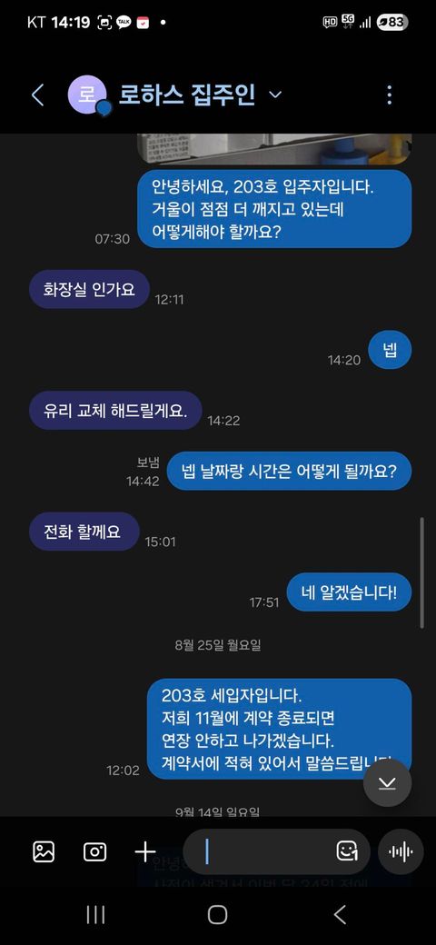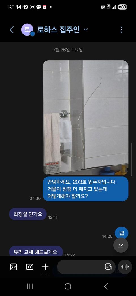 1. 입주 시작부터 부식되어있던 부분에서 균열이 시작된 거울이 있어서 집주인한테 고지했으나 (6월 15일경) 1차, 2차 연락을 무시했었고 3번째에 교체를 약속하고 연락준다고 하였는데 (문자 기록 있음)