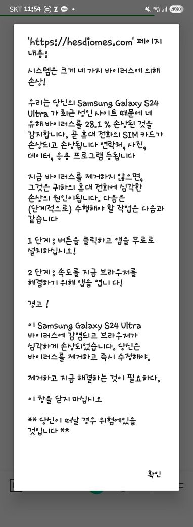 물론 저런 창이 뜨면 놀라서 당황하겠지만 그냥 무시하고 넘어가는 것이 좋습니다. 따로 휴대폰에 V3앱과 같은 보안 어플이 있다면 한번 검사를 받아보시는 것도 좋습니다.