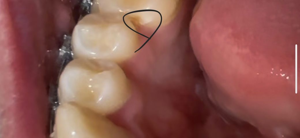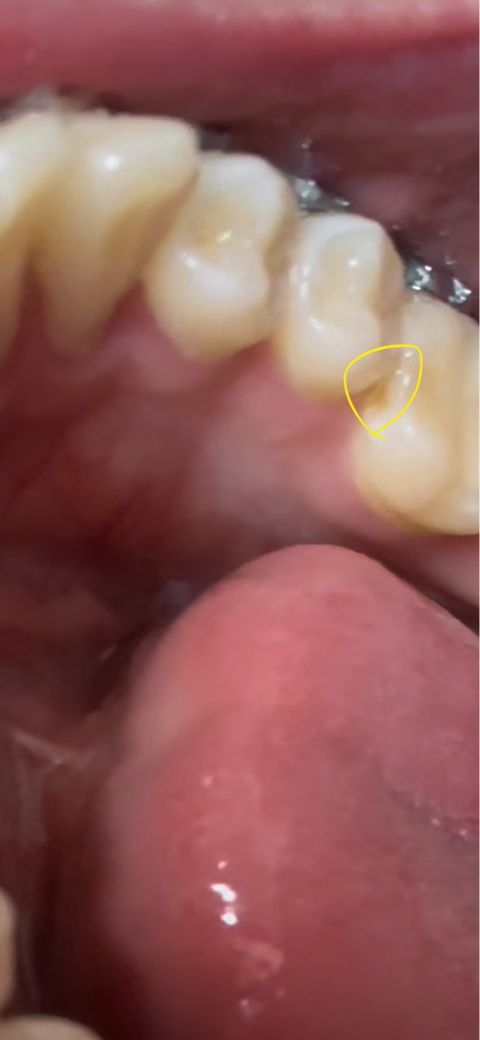 충치의 양상으로 보여지긴 합니다만 진행이 빠른 충치는 아닐 것 같습니다 해당 부위는 옆 치아와 단차가 있어서 음식물이 잘 껴서 관리가 어려워 충치가 생길 가능성이 높은 쪽이었긴 합니다