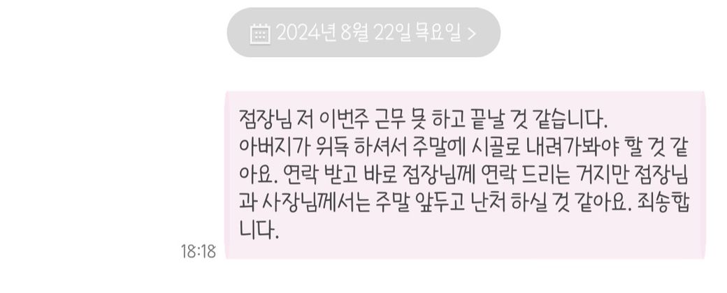 안녕하세요. 저는 카페에서 근무하고 있고 점장님께 8월 4일에 8월 말까지만 일한다고 하였습니다.
