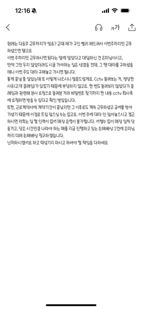 갑자기 장문의 글을 보내면서 cctv 본 거랑, 근로계약서 끝났는데도 근무해서 돈 받아갔으니 트집 잡을 생각 하지 말고 대타나 구해라 하시는데 8월 3일까지가 근로계약서 기간이고 일단 전 8월 급여를 아직 받지 않았습니다. 다른 알바생분께 대타 문자 드려보긴 할건데 못 구하고 가면 손해보상 청구가 되나요?