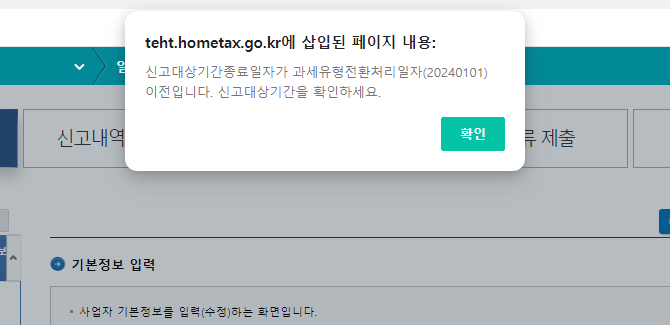 "신고대상기간종료일자가 과세유형전환처리일자(20240101) 이전입니다. 신고대상기간을 확인하세요"