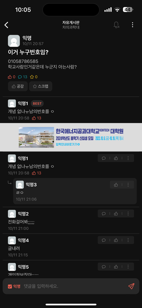 현행 개인정보보호법은 개인정보를 처리하거나 처리하였던 자가 타인의 개인정보를 유출하는 행위를 처벌하고 있습니다. 개인정보 처리자가 아니라면 처벌대상이 아닙니다. 해당 게시판에서 핸드폰번호를 유출한 자가 개인정보처리자라면 처벌대상이 될 수 있는데, 질문주신 내용만으로는 개인정보처리자인이 여부가 확인되지 않습니다. 신고하시더라도 경찰에서 처리되지 않을 가능성이 큽니다.