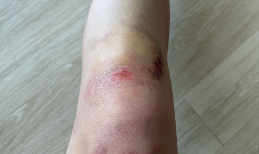 사진상 무릎의 찰과상(road abrasion)으로 보이며, 중심부에 홍반과 삼출이 있고 주변에 멍이 동반되어 있습니다. 일주일 경과 후에도 진물과 냄새가 있다면 단순 치유 과정이라기보다 국소 감염 또는 접촉성 피부염 가능성을 고려해야 합니다.