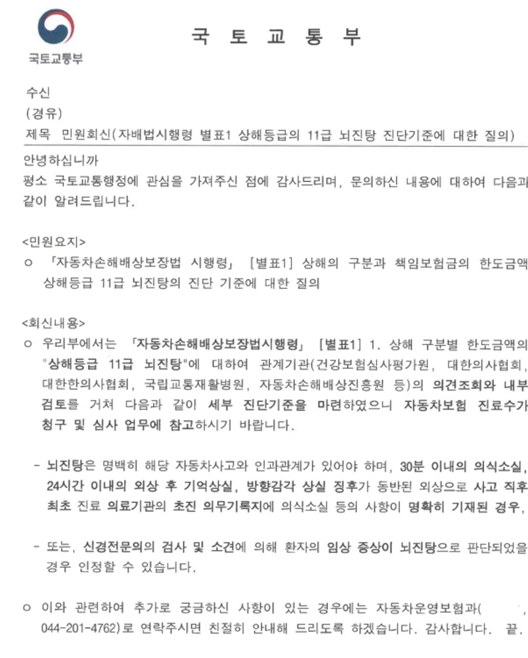 국토교통부에서 11급 해당되는 뇌진탕진단을 세부규정을 두었습니다. [첨부파일]