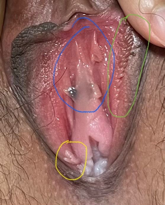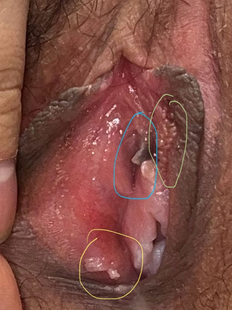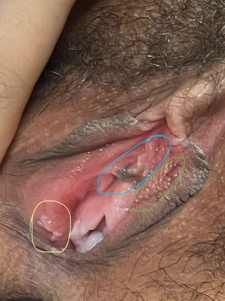 요도 쪽(파란색 동그라미),오른쪽 소음순(연두색 동그라미), 질 입구 아랫쪽(노란색 동그라미)에 곤지름(콘딜로마)처럼 생긴게 발견돼서 병원에 방문하였습니다. 방문 당시 의사께선 육안으로 봤을 땐 곤지름이 아니라 질 주름 같다라 하셨습니다. 다행히 성병 검사 후 음성이었지만, 당시 남자친구와 만난지 한달 정도 된 시기였던지라 혹시 잠복기라 음성이 뜰 수 도 있나요? 또한 요도 쪽 까만색은 뭔가요?