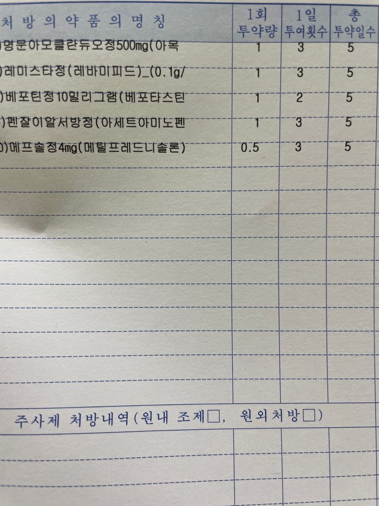 사진에 표시된 약들 중에서 특별히 심각한 부작용을 유발할 가능성은 매우 낮으며, 단기 처방 기준으로는 안전하게 복용 가능한 조합입니다. 걱정하신 스테로이드제도 5일 단기 처방이며 용량도 낮고, 위 보호제도 함께 처방되어 있어 부작용 위험은 거의 없다고 보셔도 됩니다. 알레르기, 복통, 피부 발진 등 특이 증상이 없다면 남은 기간 동안 안심하고 복용하셔도 됩니다^^