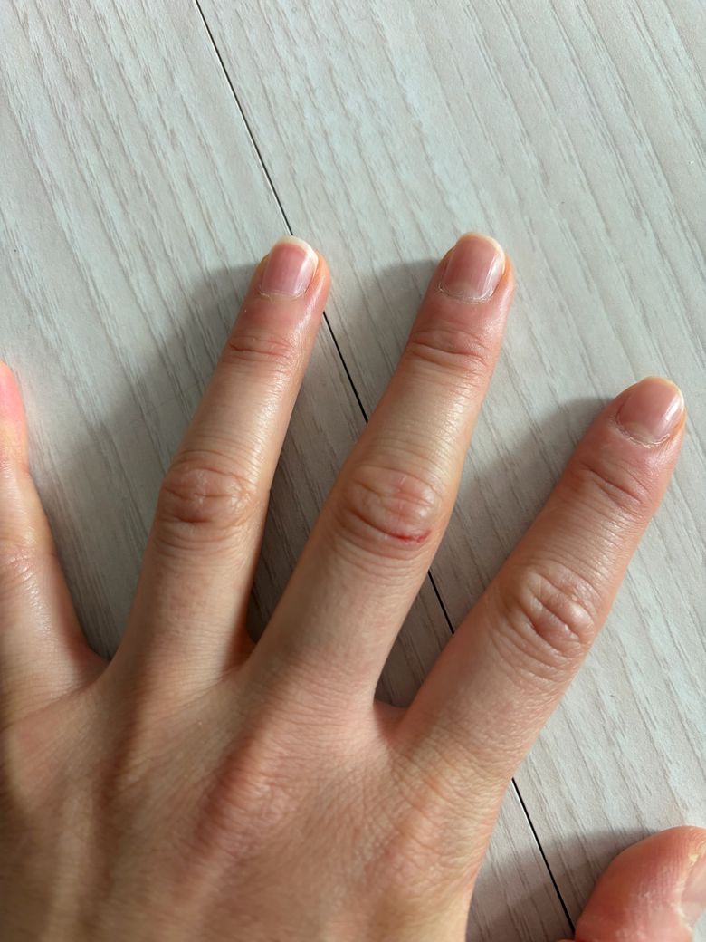 비교적 얕은 절상으루 보이며 큰벌어짐이나 출혈은 없어 큰문제는 없어보입니다. 우선 흐르는물에 씻고, 소독후 항생제연고를 바르고 밴드로 보호해주세요. 마디부위라 움직일때 벌어질수 있어 며칠을 과도한 사용은 줄여주세요. 상처가 벌어지거나 피가나면 의료용 테이프로 살짝 모아주는것도 도움이 됩니다.
