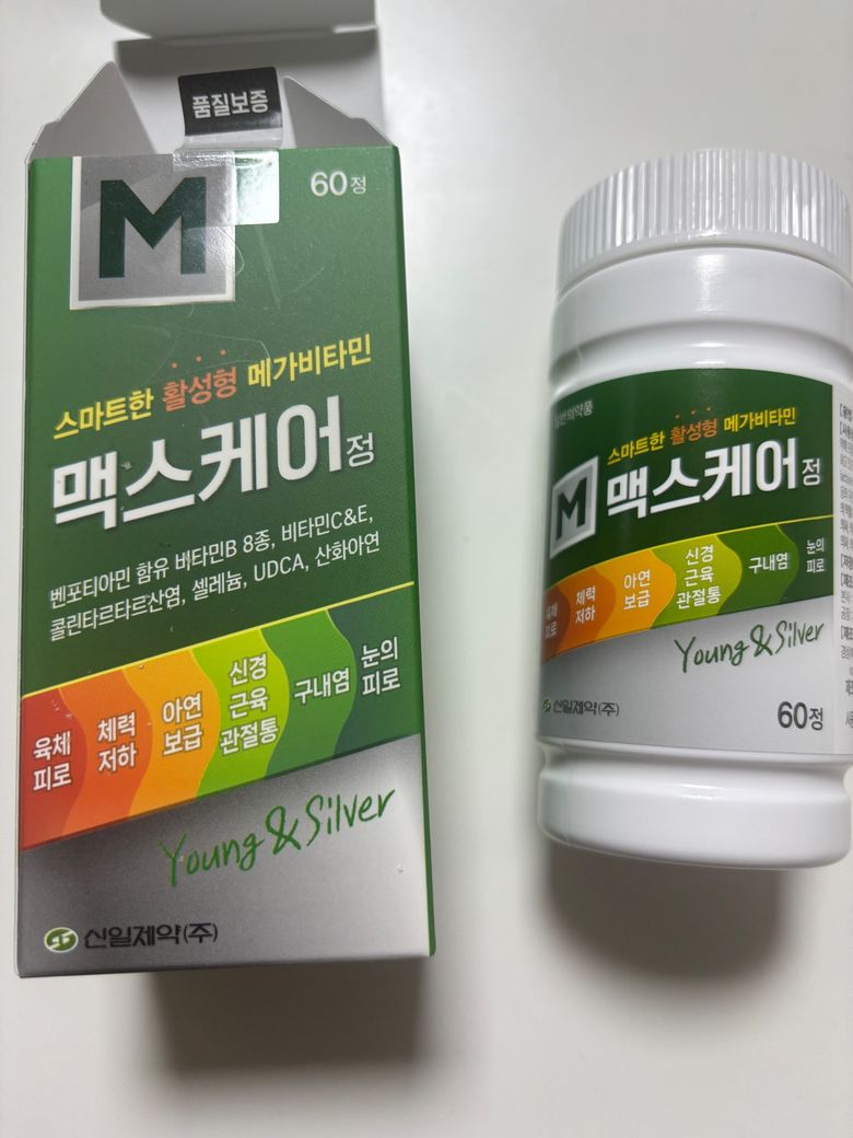 일반의약품 영양제인 맥스케어정은 비타민 B군과 아연, 비타민C, 셀레늄 등의 성분들로 구성된 종합비타민입니다.