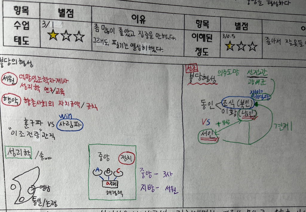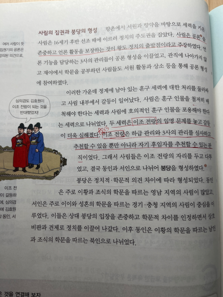 * 선조(조선 14대 왕, 이름 이연 / 재위 1567 ~ 1608) 때 사림이 동인(김효원 중심, 신진사림)과 서인(심의겸 중심, 기성사림)으로 분당된 것이며, 통일, 논쟁 등의 용어로 보아 성리학이 한반도에 정착하면서 나타났던 현상을 표현한 것으로 보여집니다. 그렇게 아주 중요한 그림은 아닌 걸로 보여요.