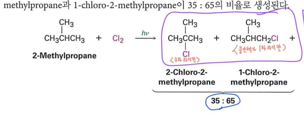 라디칼 반응에서 생성물 수득률은 중간체가 더 안정한 라디칼에서 파생된 생성물이 주 생성물인것으로 알고 있습니다. 근데 여기서 수득률이 65%인 생성물의 중간체는 1차 라디칼이고, 수득률이 35%인 생성물의 중간체는 3차 라디칼인데 왜 이런건가요?