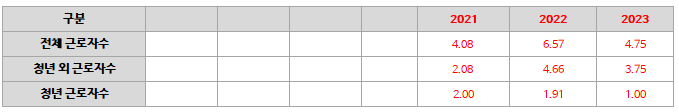 다만, 청년이 21년 대비 23년에 감소했으므로 21년 상시근로자수 증가분 전체에 대해서