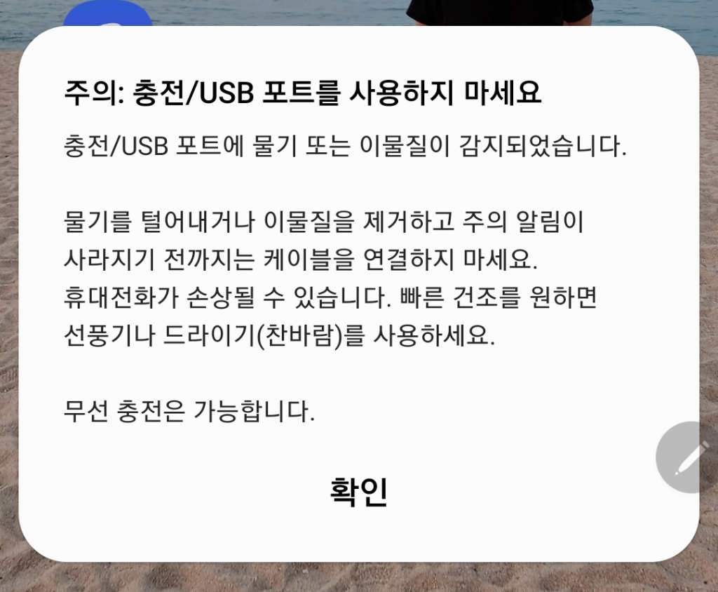 충전기 입구에 물기가 살짝 있을때도 그런 메시지 나옵니다