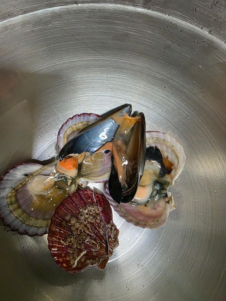 해물탕 재료중 일부 조개에 대한 질문인듯 합니다. 조개류는 날씨에 따라 달라지는데 냄새가 많이 나고 꾸리하면 상한건데 사진으로는 신선하지 않은듯합니다. 버리시는것이 좋을듯 합니다.