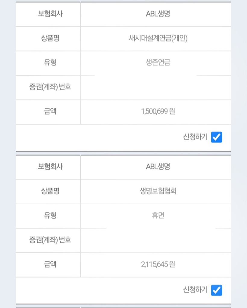 미청구 보험 안내라고 해서 몇가지 보험 목록과