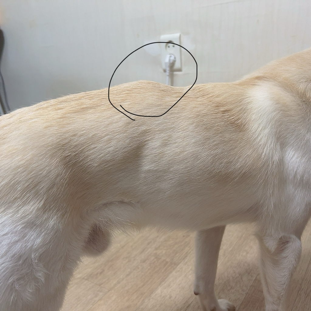 뼈의 이상이라던지 디스크가 원인이라면 저렇게 되지 않습니다. 걷거나 산책시 큰 이상이 없을 경우 자세에 따라 부위가 도드라져 보일 순 있습니다. 저 부위는 척추뼈의 가시돌기 부위인데 그 부위에 살이 더 붙었더라면 염증이나 혹이 있을 가능성이 있으니 병원에 내원하여 확인해보셔야합니다.