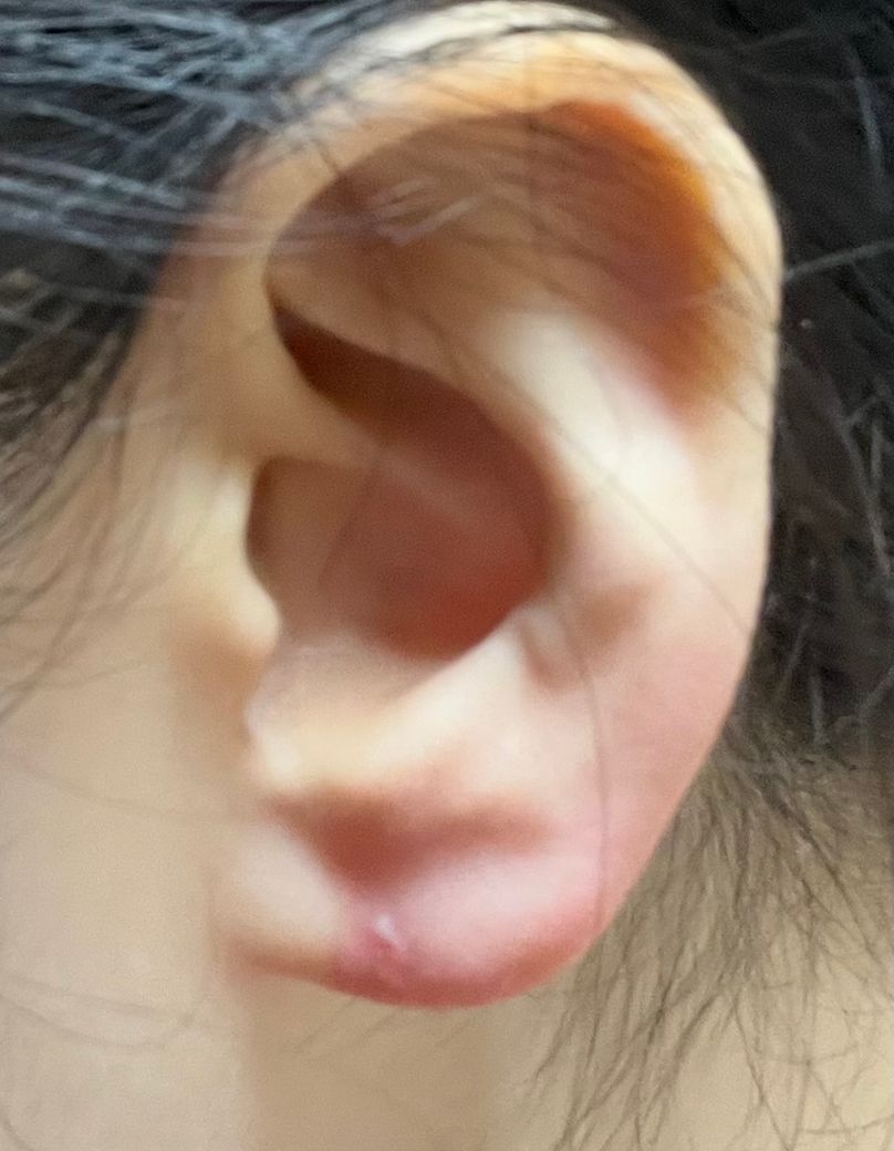 사진처럼 귓볼이 특정 부위만 동그랗게 빨갛고 뭐 하얀 흉터같은 게 올라왔는데 뭘까요ㅜㅜ 귀걸이는 뺀지 2년정도 넘어서 막혔습니다 눌러도 아프지도 않고 가렵거나 그러지도 않습니다