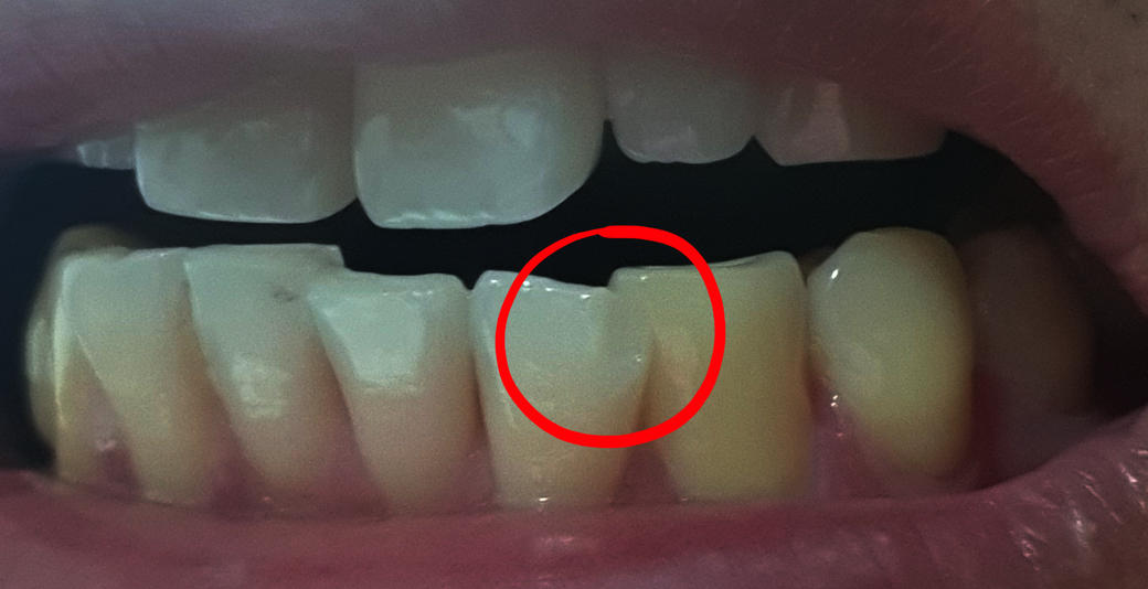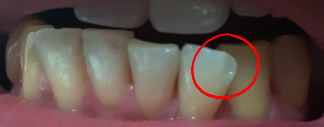 이틀 전에 밥 먹다가 쇠젓가락을 실수로 씹어서 사진처럼 이빨이 찌그러져 움푹 패이게 되었습니다